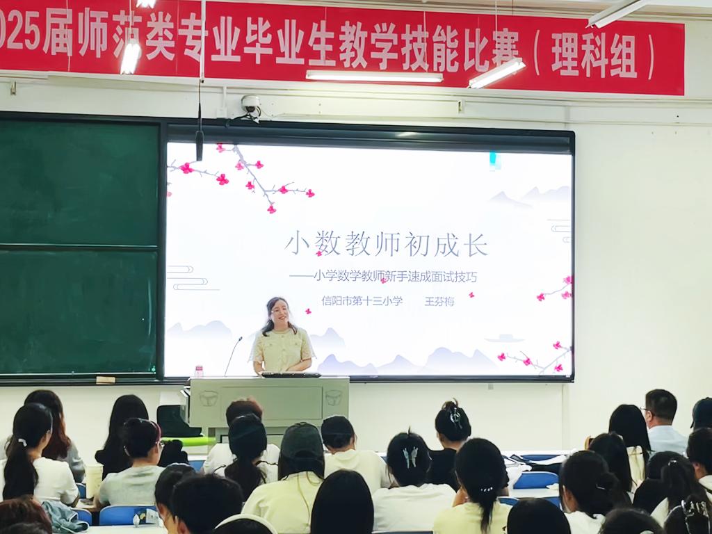 9月20日上午,信阳市骨干教师王芬梅在社科楼121教室为太阳城官网师生作题为“提升师范技能 促进职业发展”的报告。小学教育专业2022级全体学生、研究生及相关教师参加此次报告会。报告会由张祥耀主持。