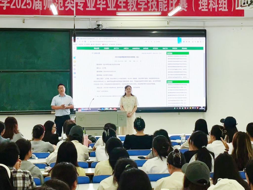 报告会上,王芬梅结合自己多年的教学经验、面试评审经历,深入浅出的分析了小学数学教师面试的各个环节和注意事项。首先,王芬梅强调一位合格教师应该以“四有好老师”的标准要求自己,做到道德高尚、热爱学生、心中有爱、眼里有光、学识扎实。然后,王老师强调必须熟悉教材,掌握四种教学模式。她指出,大家要深入学习2022版小学数学课程标准,熟悉并掌握教材内容,特别是数与代数、图形与几何、概率与统计等核心知识点。她建议同学们在面试前务必仔细阅读教材,整理好前后知识等承接关系。最后,王老师就面试时“无生试讲”和说课两方面做了详细讲解。她强调,面试时间有限,同学们必须要有自己的面试模版—私人定制面试模版。在模版上要体现“导入新、探究实、巩固练习分层次、作业布置质量高、课堂总结全面、板书设计图文并茂”等方面。王老师鼓励大家明确方向、积极主动、持之以恒、挑战自我,为基础教育高质量发展贡献力量!