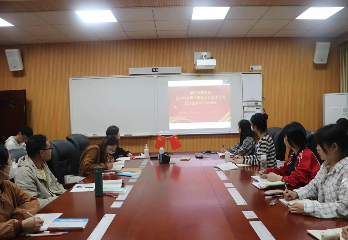 5月5日晚,澳门太阳集团城9728在教七楼301分党校会议室组织第39期党员发展对象观看以“新时代新征程坚持和发展中国特色社会主义的政治宣言和行动纲领”为主题的辅导报告,马克思主义学院副院长陈晋富教授担任授课人。