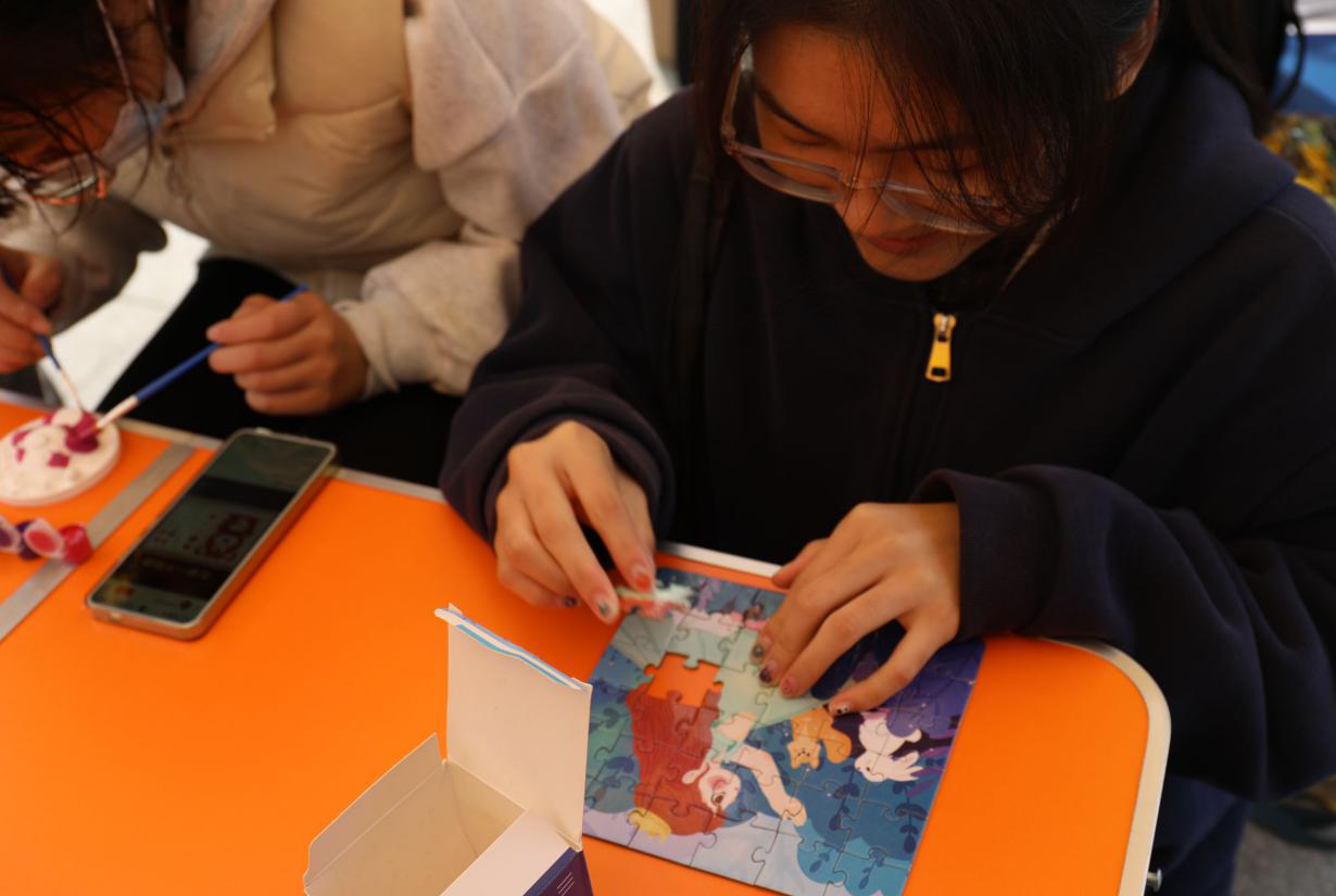 在“拼图大挑战”环节,同学们随机两两分组进行友谊赛,工作人员将一幅幅精美的拼图拆分成众多小块,同学们需全神贯注、眼疾手快,依据脑海中的图像构思,与队友紧密协作,争分夺秒地拼凑还原,极大地锻炼了同学们的逻辑思维能力,增强了同学们的团队合作意识。