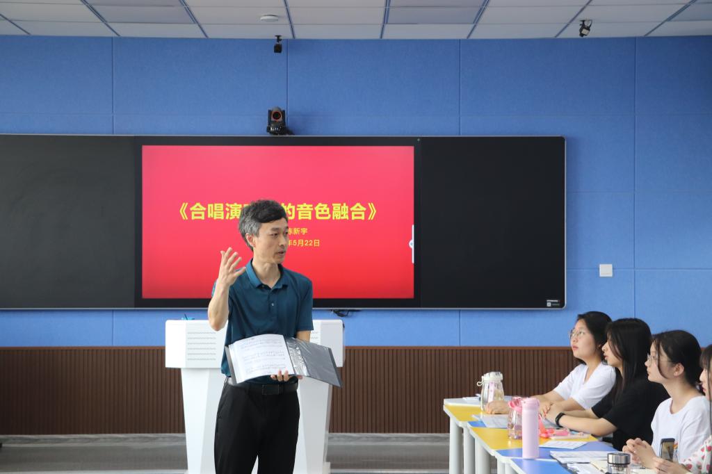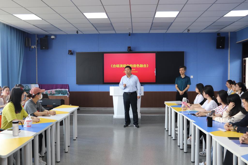 为了丰富学生校园生活,进一步提升学院合唱团的整体水平,应澳门太阳集团城9728邀请,陈新宇教授于5月22日上午在人文楼707教室作了以“合唱演唱中的音色融合”为主题的讲座。澳门太阳集团城9728付永昌院长、赵菲、李杨老师,“师之韵”合唱团成员以及2019级红色园丁班学生参加了此次讲座。讲座由付永昌主持。
